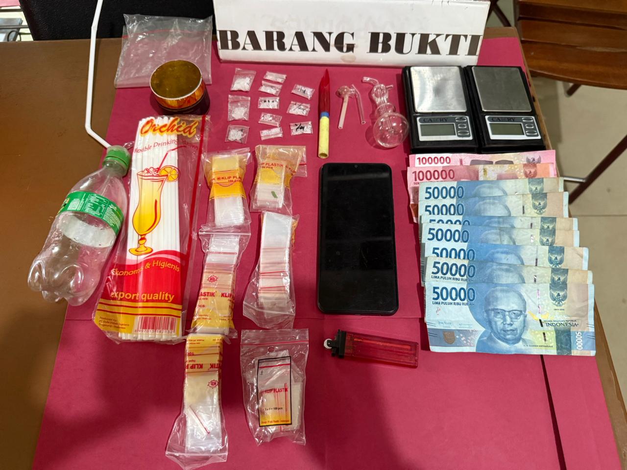 Dari tangan tersangka, petugas menyita 11 paket sabu siap edar, dua timbangan digital, dua alat hisap sabu, uang tunai Rp550.000 hasil transaksi, serta sejumlah perlengkapan lainnya seperti plastik klip kosong, pipet, sendok takar, korek api, dan satu unit handphone Vivo Y20.