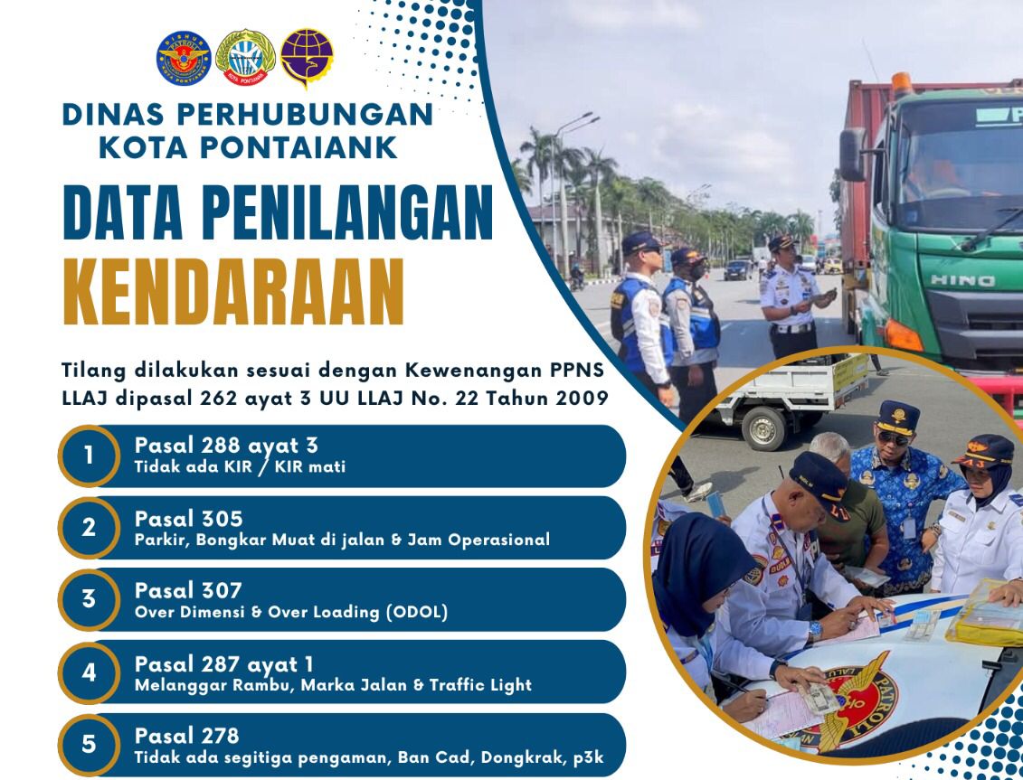 PONTIANAK – Kepala Dinas Perhubungan (Dishub) Kota Pontianak, Yuli Trisna Ibrahim, menyampaikan hasil rekap kegiatan Patroli Lalu Lintas dan Angkutan Jalan (LLAJ) Gabungan bersama TNI/Polri selama bulan September 2025. Patroli ini fokus pada penindakan pelanggaran kendaraan tronton dan trailer yang tidak sesuai dengan ketentuan perundang-undangan yang berlaku.